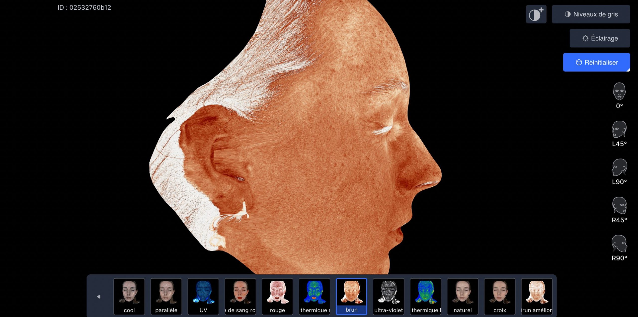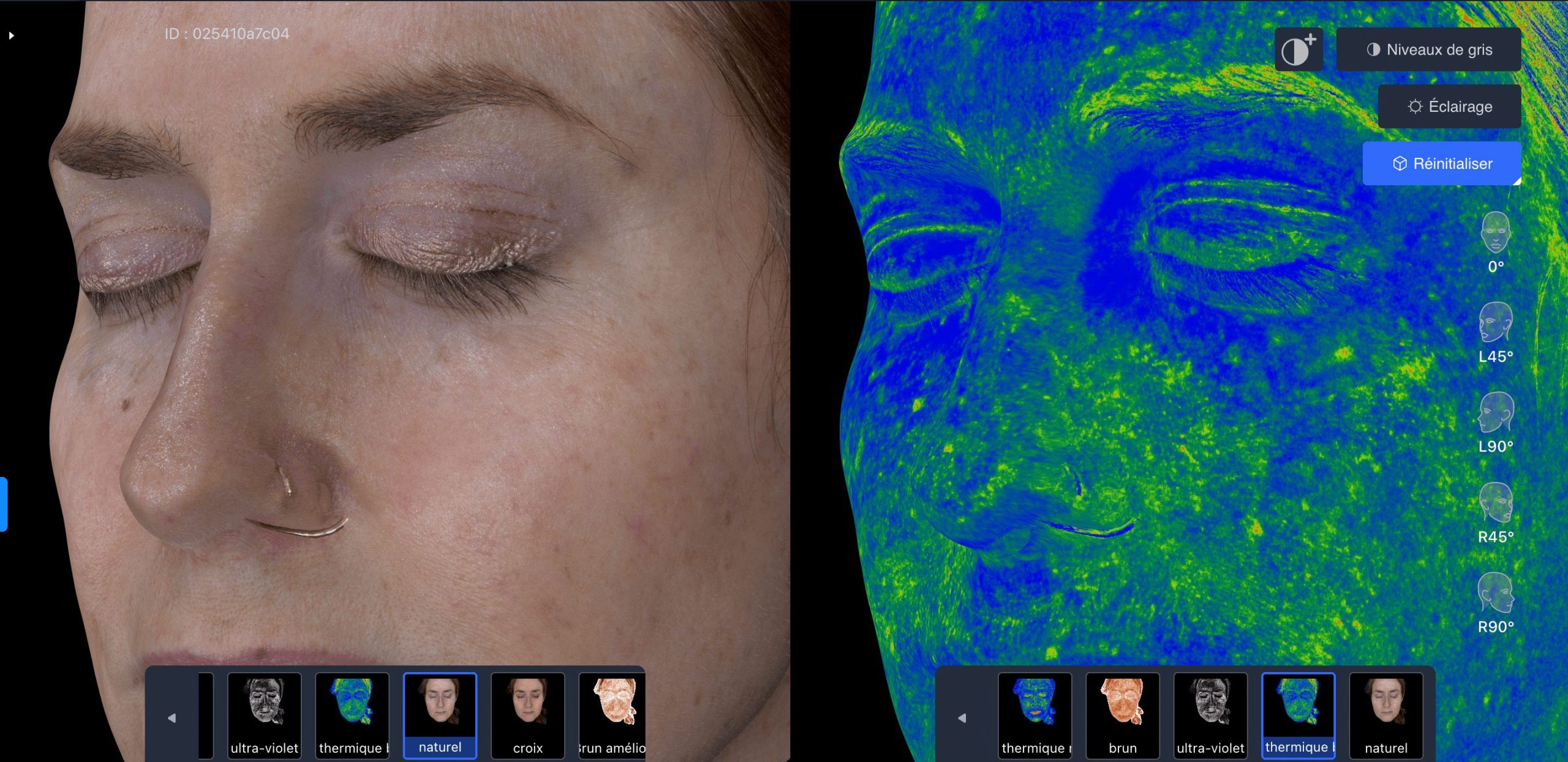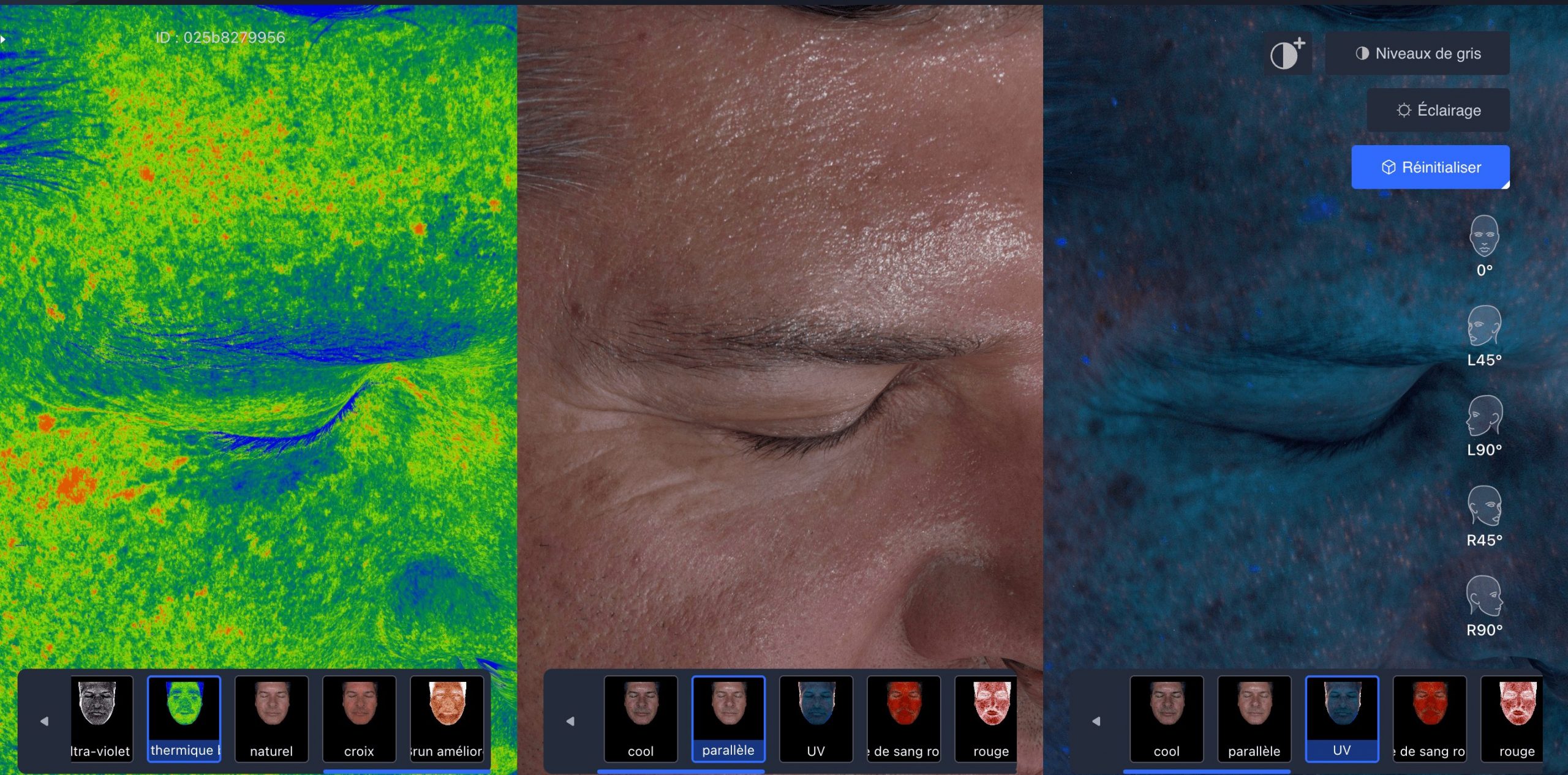 Le visage dans son ensemble : texture, pores, pigmentation, rougeurs, vascularisation, morphologie et projections de vieillissement.